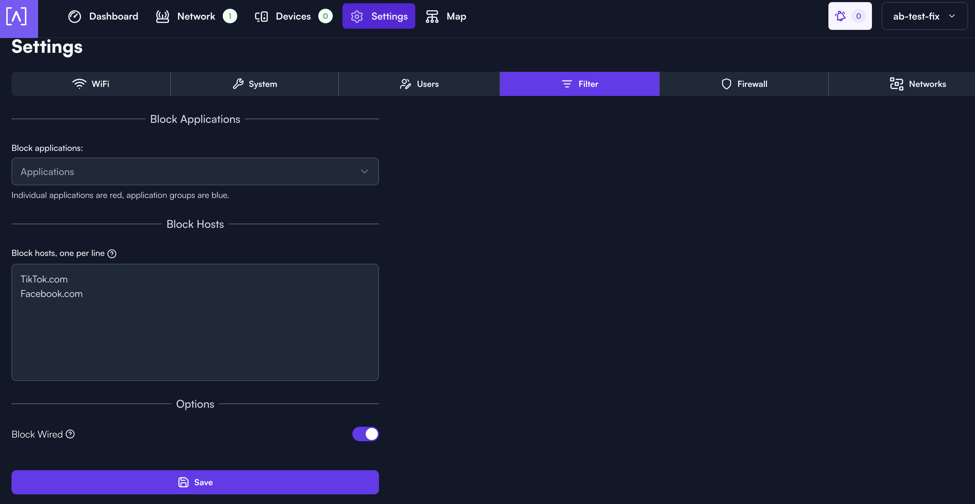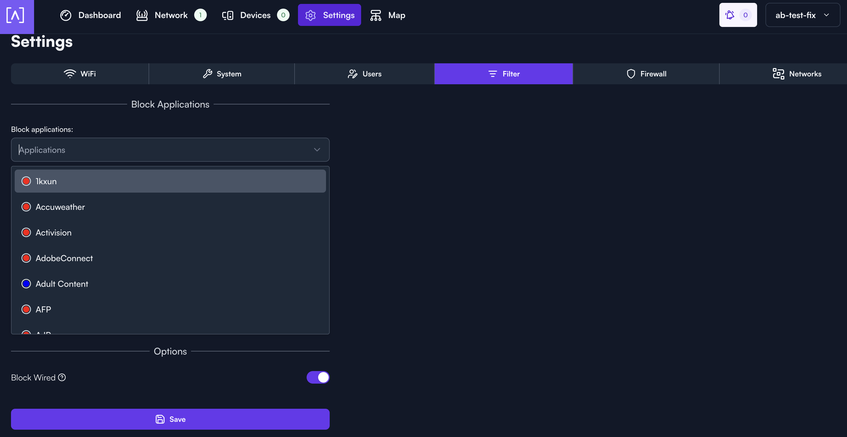 First, log into manage.alta.inc, then select the site you would like to create a filter policy for. You can find your sites using the drop down menu in the upper right hand corner of your screen. Now, select the settings tab. From the settings tab, you will select "Filter". Two different menus will appear. First will be the "Block Applications" drop down. You can select as many different applications by name or application groups as you want. You can start typing the name of application or application group and the list will be filtered as you type.