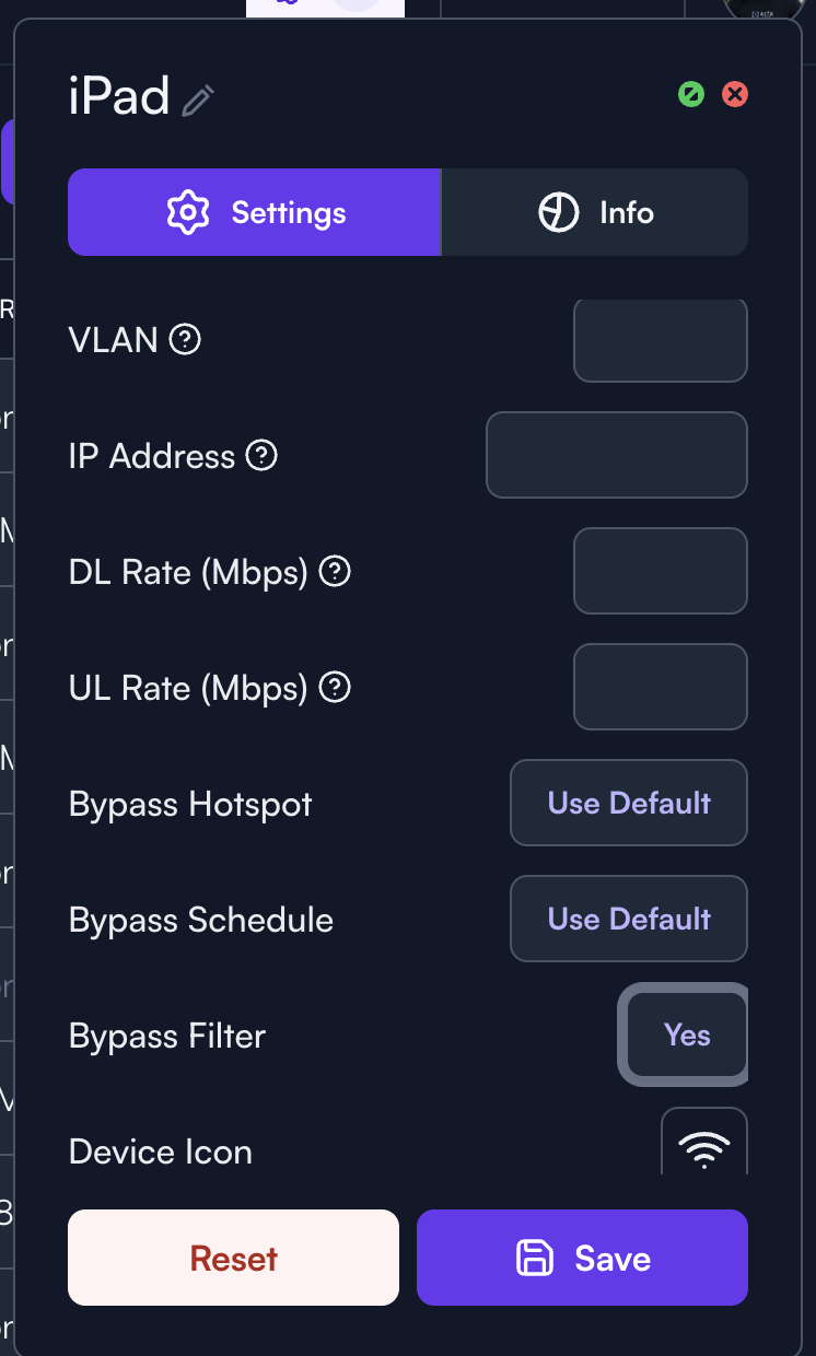 If you have users who don't need to be governed by the filter policy, you have the ability to bypass the filter using our Multi-Password technology. To enable this, head over to "Settings", navigate to the SSID you are applying the filter to. Then select the password policy you want to have ignore the filter policy. Click on the purple button that is named after the password policy you have selected. Scroll to the bottom of the drop down menu and select "Bypass Filter". Now, make sure the password policy that will use the filter policy, does not have "Bypass Filter" checked. Hit the save button and you're good to go!