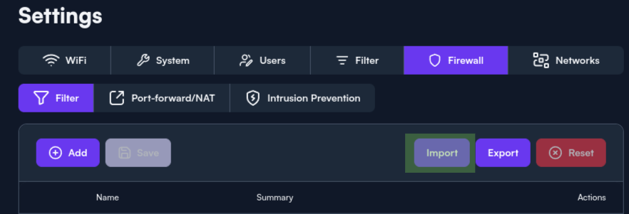 Warning: The Reset button may also be used to restore the firmware default rules. However, this will destroy any custom rules that you have deployed at the same time.