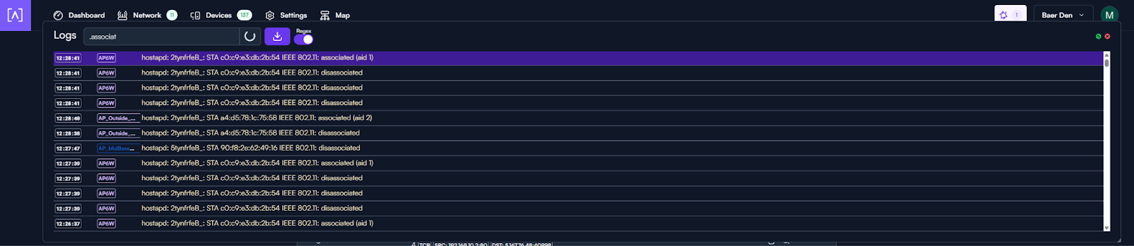 In the above example, note that the intent was to look for all WiFi associations and disassociations. In this case, . is used as well as a number of letters that would appear in both “associated”, “disassociated”, and will match any word that contains “associat”. Also note that the Regex toggle is set to on. The output shows me all log entries where a device either associated or disassociated with any AP on this network.