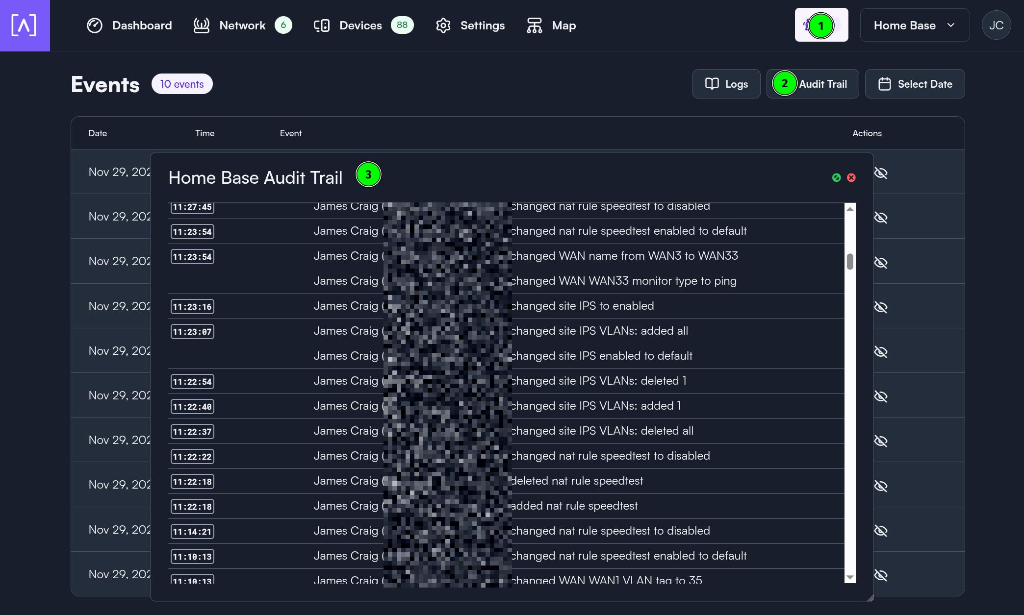 The full audit trail for the selected site is available under Events (notification bell) → Audit Trail. This view shows all recorded configuration actions across the site, including but not limited to changes to networks, WANs, firewall rules, IPS, VLANs, and user management.