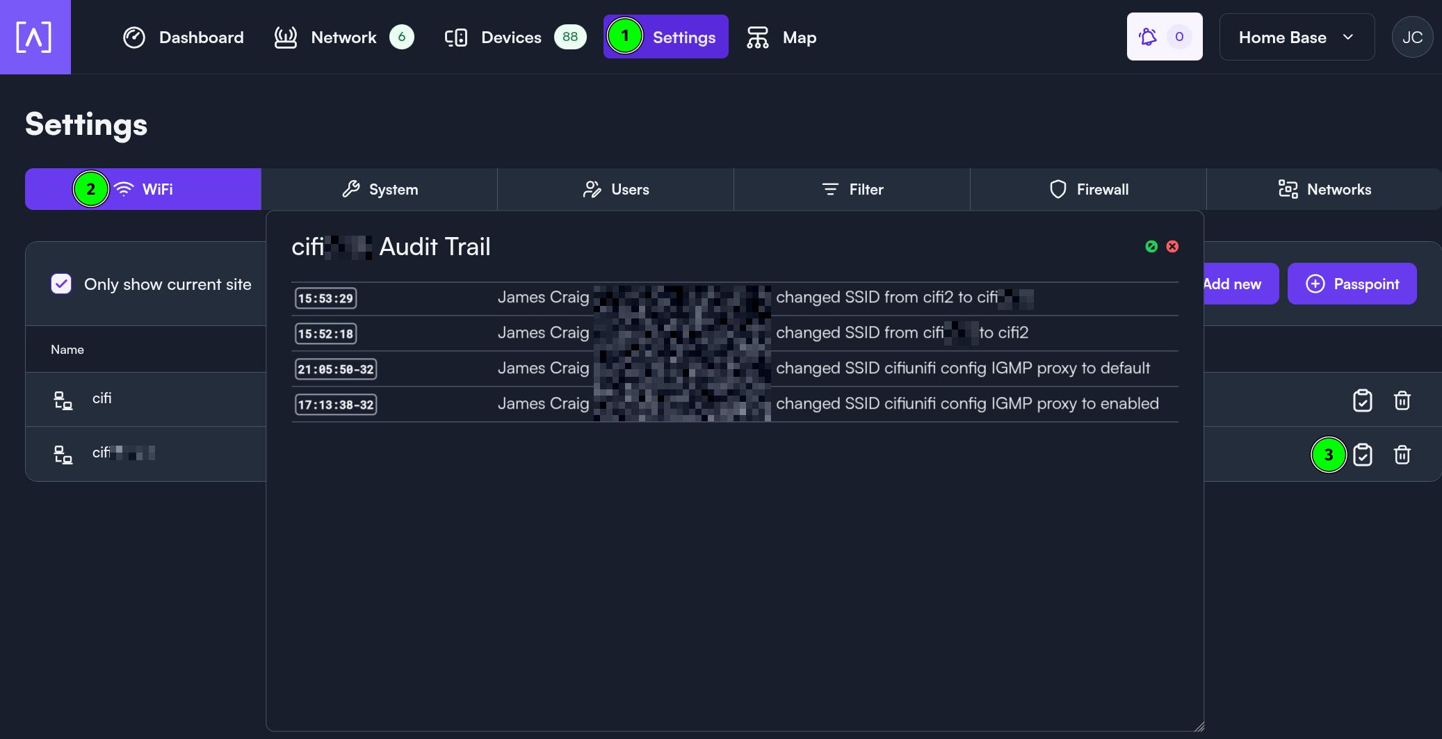 SSID-specific audit data can be accessed within Settings → WiFi, by selecting the SSID and opening its Audit Trail panel. This view shows changes scoped only to that SSID (e.g., SSID name changes, security settings, VLAN/IGMP adjustments).