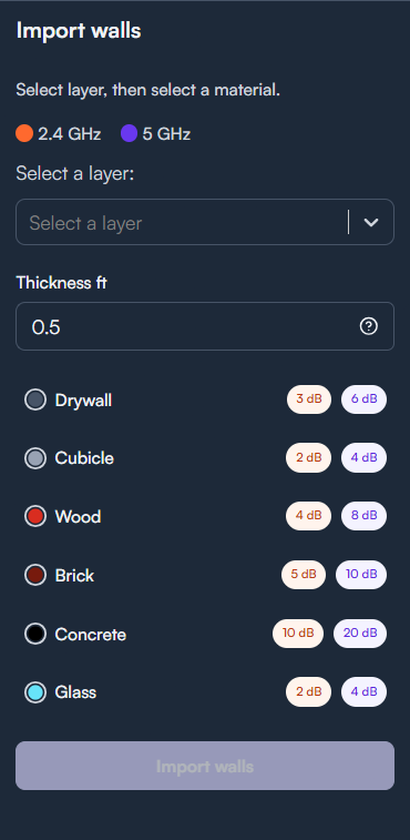 Now for the fun part. Click on the Draw Walls in the navigation bar above, here is where it gives you the option to Draw Walls or Import Walls. If your PDF is utilizing Layers, importing walls will allow you to assign material and thicknesses to the walls/windows assigned to that entire layer. Each wall material has its own signal attenuation factor, the higher the number in dB - the more attenuated (suppressed) the signal will be (2.4 GHz listed in orange, 5 GHz listed in purple). Keep in mind that – for the same signal strength – 5 GHz signals travel half as far as 2.4 GHz signals, which is expected due to the higher frequency of 5 GHz. The higher the frequency, the more suppressed the signal will be traveling through anything, including open air. Conversely, the lower the frequency, the signal will be less suppressed traveling through anything, including open air. The trade-off is higher frequencies = faster speed (due to much more spectrum available), but less range. Lower frequencies = more range, less speed.