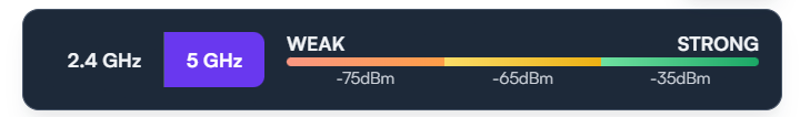 Notice how the signals propagate throughout the floor and walls. You can also toggle between 2.4 GHz and 5 GHz on the bottom-right of the screen. In the same place, you can also see signal attenuation scale. If you hover around your mouse on the floor, a dot will appear on the scale showing what the signal will approximately look like in that specific area. Red being the weakest signal, green being the strongest.