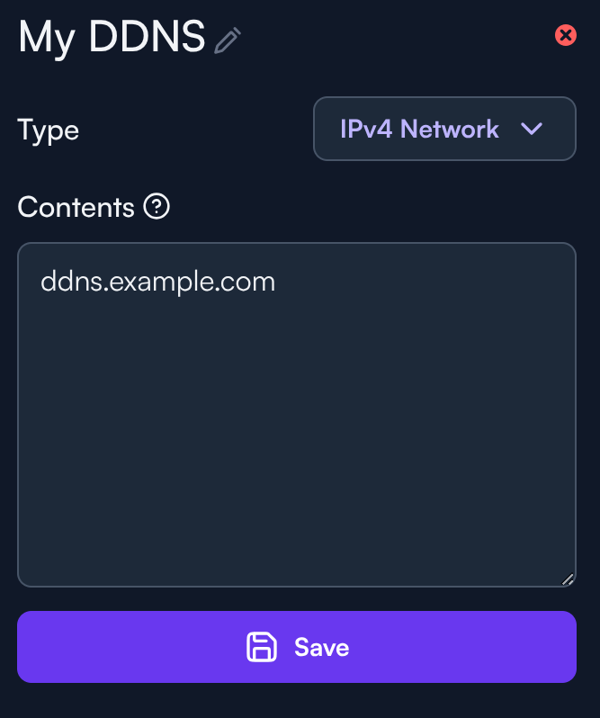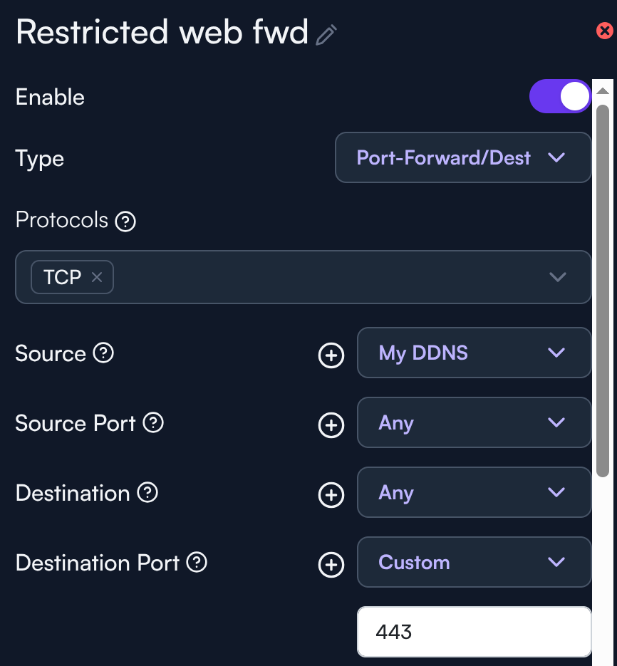 Para este ejemplo, queremos reenviar un puerto para un servidor web solo para tráfico proveniente del nombre de host DNS dinámico ddns.example.com. Esto es mucho más seguro que abrir un puerto a toda la internet ya que mantiene su superficie de ataque limitada solo a las IP(s) a las que el nombre de host resuelve. Idealmente, una VPN es una mejor opción, pero para casos donde eso no es viable, un reenvío de puerto restringido por origen proporciona mucha mejor seguridad que un reenvío de puerto abierto.