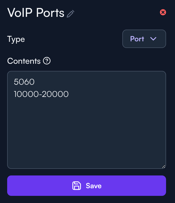 Nombre: haga clic en el lápiz en la parte superior para editar el nombre. Lo llamaremos Puertos VoIP.