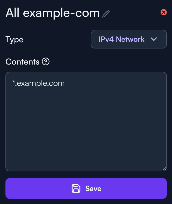 Los grupos de redes IPv4 e IPv6 soportan más que solo direcciones IP estáticas y subredes. Además de las entradas estándar de red, también soportan nombres de host exactos y dominios comodín. Estas entradas basadas en dominios se manejan de manera diferente según el tipo de coincidencia.