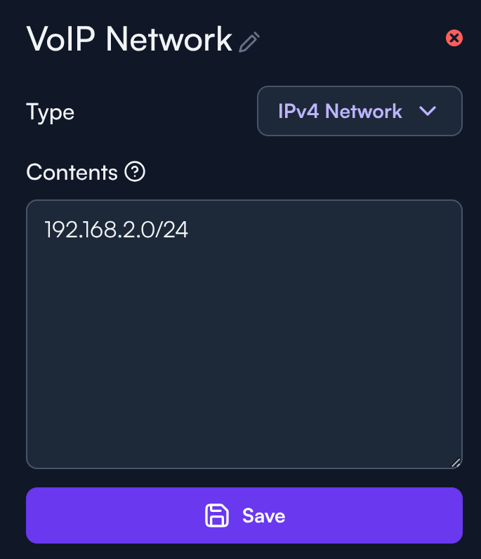 - Grupo de Redes IPv4: Un conjunto reutilizable de redes IPv4, direcciones y entradas de nombre de host/dominio compatibles.