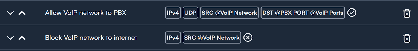 Es importante mantener el orden permitir, luego bloquear. Si reordenara las reglas para que el bloqueo viniera antes que el permitir, entonces todo el tráfico de la red VoIP sería bloqueado y no se permitiría a los teléfonos alcanzar la PBX. La primera regla que coincide gana.