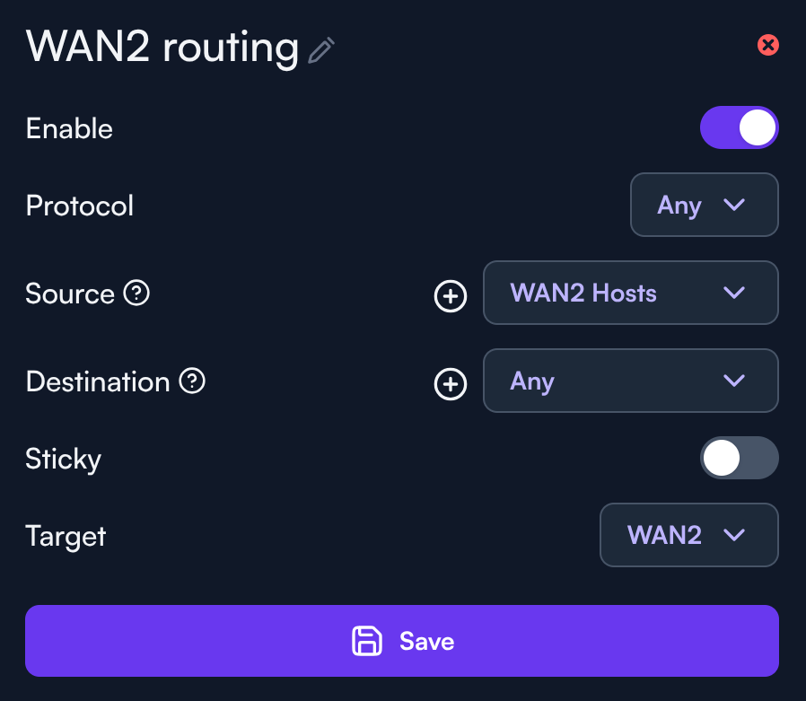 Si desea enviar una red completa por WAN2, como posiblemente una red de invitados para evitar que usen el ancho de banda de su WAN principal, simplemente añada una regla como los ejemplos anteriores especificando su red deseada en el campo Origen o grupo de firewall. Por ejemplo, si tiene una red de invitados 10.0.2.0/24, elija Origen “Personalizado” y complete 10.0.2.0/24 allí, o cree un grupo de Red IPv4 que contenga 10.0.2.0/24 y selecciónelo.